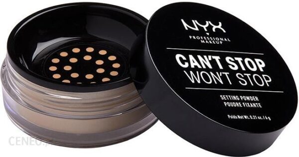 CANT STOP WONT STOP – SETTING POWDER marki NYX Professional Makeup. Puder do twarzy. Przeznaczony dla każdego rodzaju skóry. Nałożony na makijaż, zapewnia długotrwały efekt perfekcyjnej skóry oraz przedłuża trwałość kosmetyków. Stworzony na bazie specjalnej formuły doskonale dopasowuje się do tonacji cery. Dodatkowo pozostawia skórę wygładzoną oraz matową. Produkt dostępny w wielu różnych odcieniach.Puder do twarzy.Silnie utrwala i matuje.Wygładza i odświeża cerę.Dostępny w wielu odcieniach.